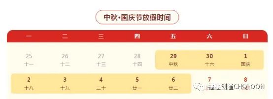 “雙節(jié)”將至,福建創(chuàng)隆公司向全體同仁及家屬,關注、關心和支持公司發(fā)展的各界朋友致以最誠摯節(jié)日祝福和衷心的感謝,提前祝您們節(jié)日快樂,闔家幸福!